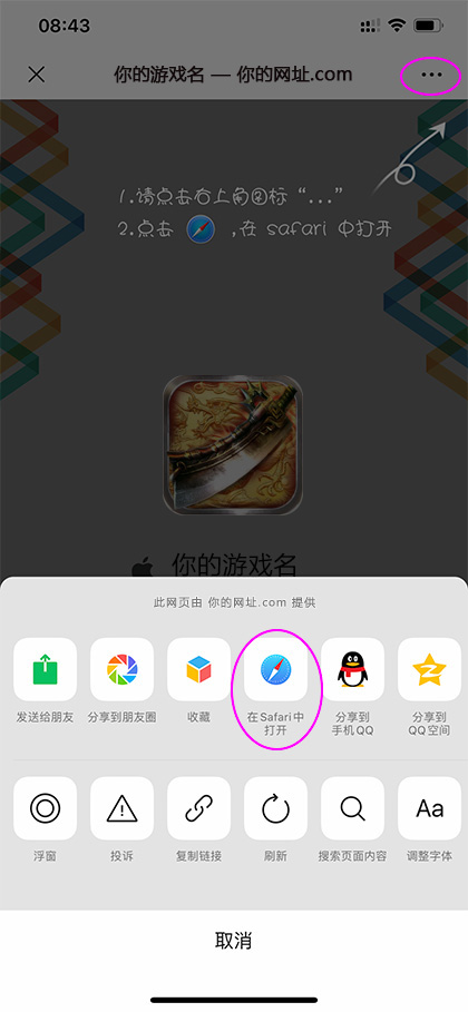 点击右上角…,选择在 Safari中打开,如图:
