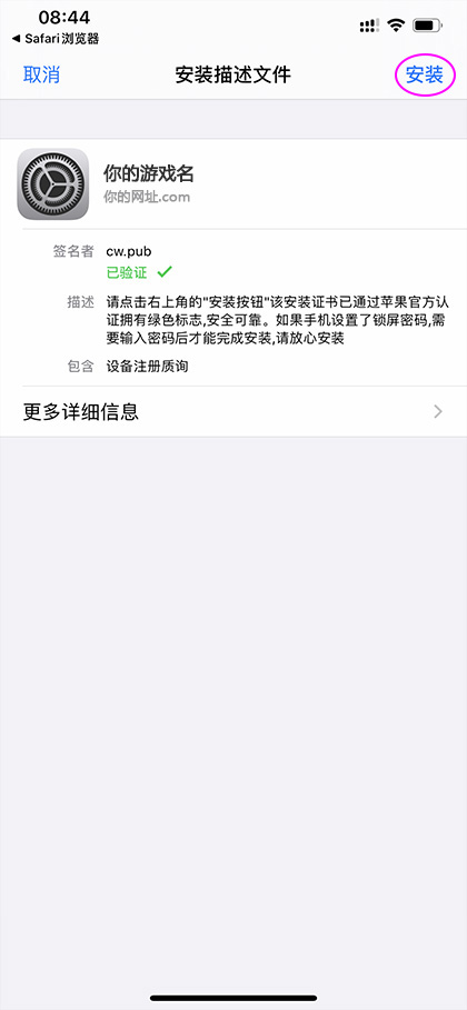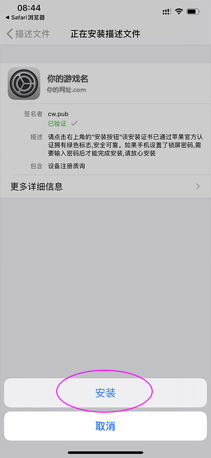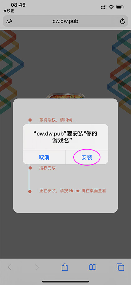 在"cw.dw.pub"要安装这个游戏,选择“安装”,如图:
